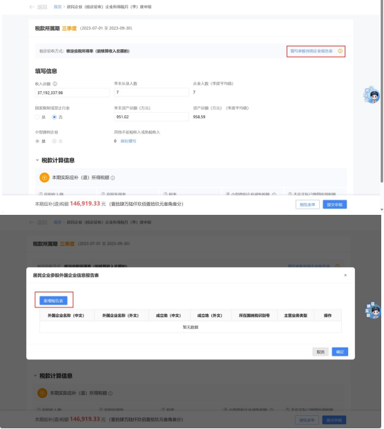 如企业需填报《居民企业参股外国企业信息报告表》,可点击右上角【填写参股外国企业报告表】跳转界面,再点击【新增报告表】进行填报。