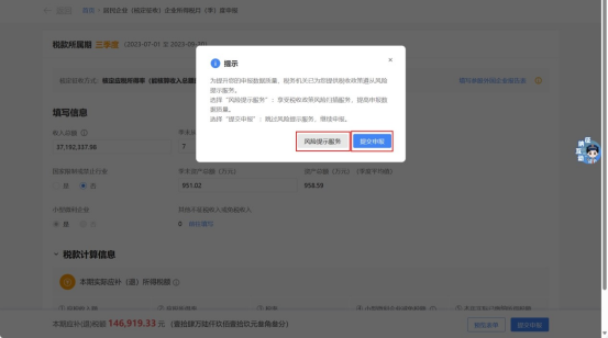 纳税人完成申报表填写后,点击【提交申报】,系统提示是否需要进行风险扫描,纳税人可点击【风险提示服务】进行风险扫描,提高申报数据质量,也可直接点击【提交申报】。