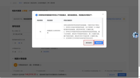 选择【风险提示服务】,系统会自动进行数据风险扫描,若存在风险疑点,纳税人可根据系统提示点击【修改表单】对数据进行修改。点击【继续申报】,会要求纳税人依次输入“真”“实”“责”“任”四个字,申报完成。