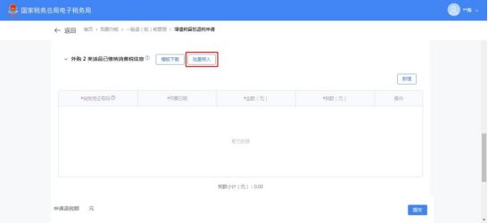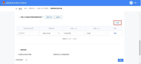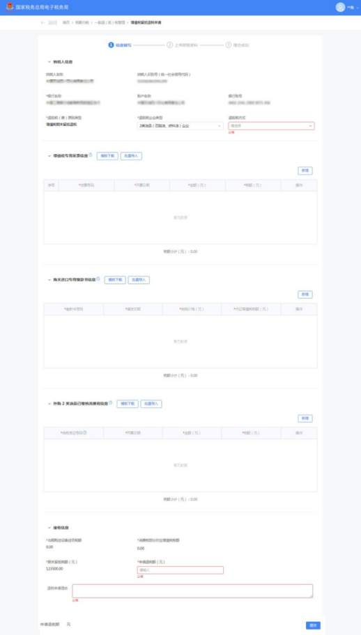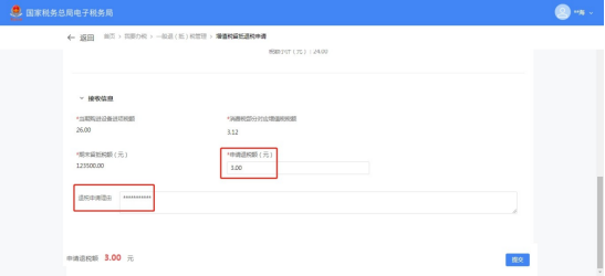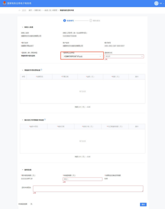 (1)选择退抵税方式,录入申请退税额和退税申请理由,点击【提交】。