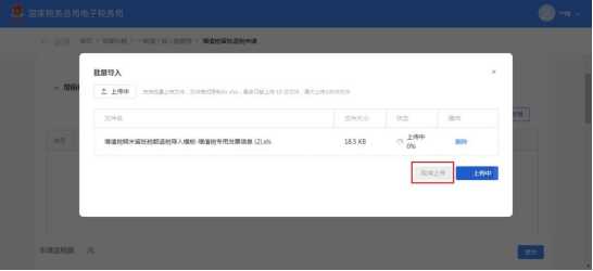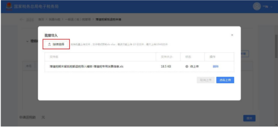 (18)点击【选择文件】,添加《增值税期末留抵税额退税导入模板-海关进口专用缴款书信息.xls》文件。