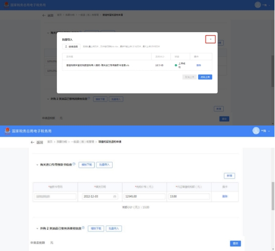 (15)点击界面框右上角【×】关闭批量导入界面框,海关进口专用缴款书信息栏带出已导入的关进口专用缴款书信息。