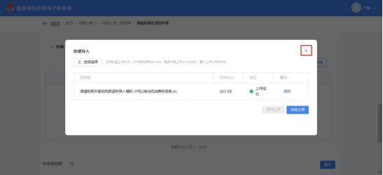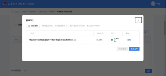 (11)上传成功后点击界面框右上角【×】关闭批量导入界面,增值税专用发票信息栏带出已导入的发票信息。