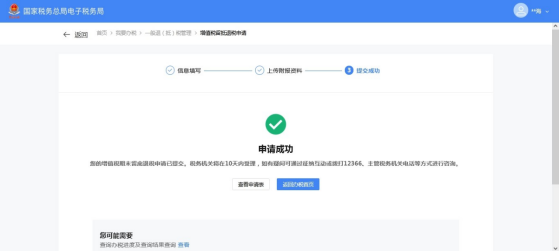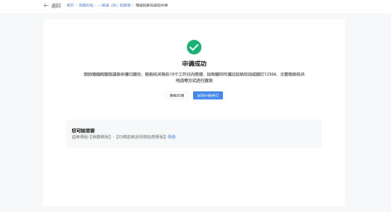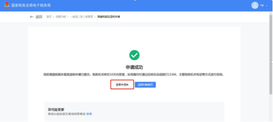 (2)系统提示申请成功。点击【查看申报表】可查看申报表,点击【返回办税糖心vlog】返回办税糖心vlog,点击【查看】可查看办税进度。
