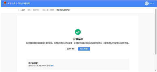 5.系统跳转申请成功界面。可点击【撤销申请】按钮撤销本次退税申请,点击【返回办税糖心vlog】按钮回到糖心vlog。