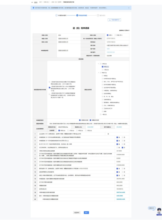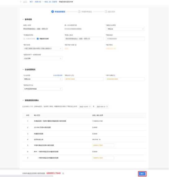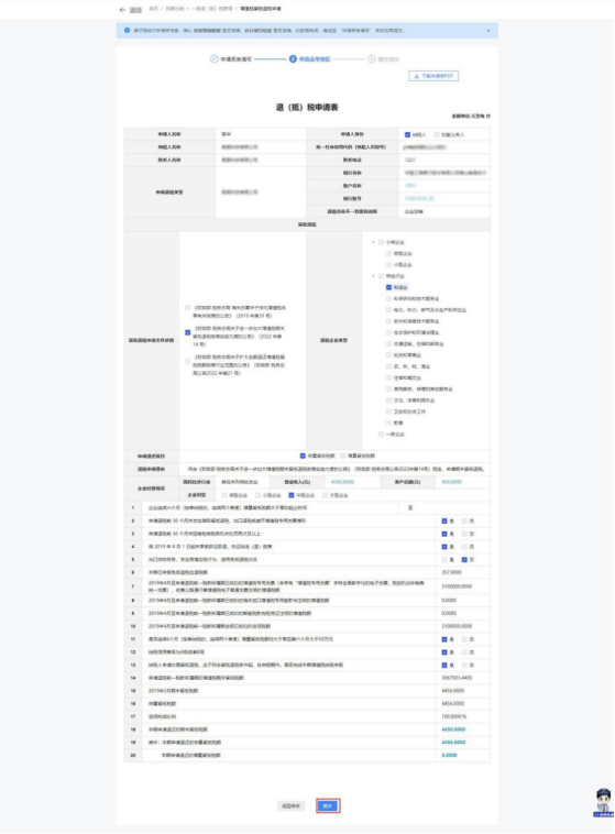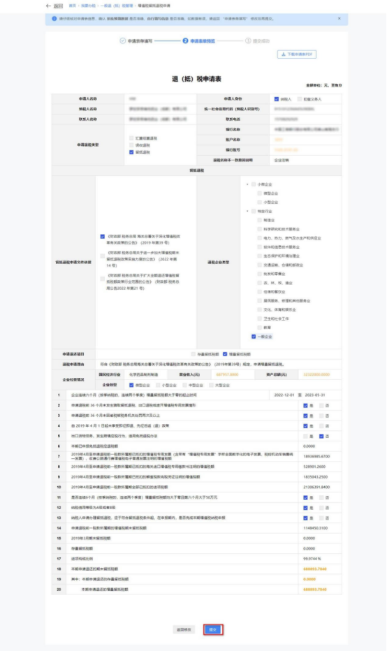 2.若退税企业类型属于“特定行业”(“制造业、科学研究和技术服务业”、“电力、热力、燃气及水生产和供应业”、“软件和信息技术服务业”、“生态保护和环境治理业”、“交通运输、仓储和邮政业”、“批发和零售业”、“农、林、牧、渔业”、“住宿和餐饮业”、“居民服务、修理和其他服务业”、 “教育”、“卫生和社会工作”、 “文化、体育和娱乐业”)的,系统自动带出留抵退税申请信息。纳税人根据实际情况修改留抵退税申请信息,点击【提交】,系统跳转申请表单预览界面。