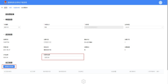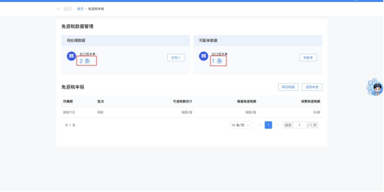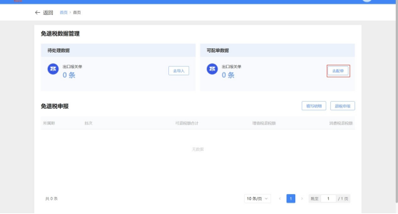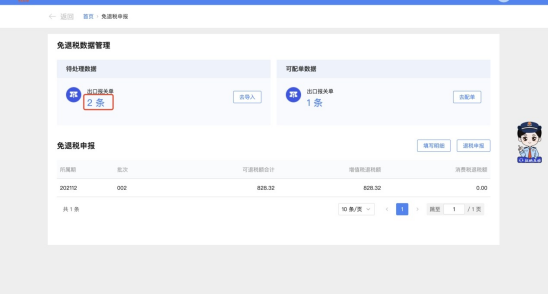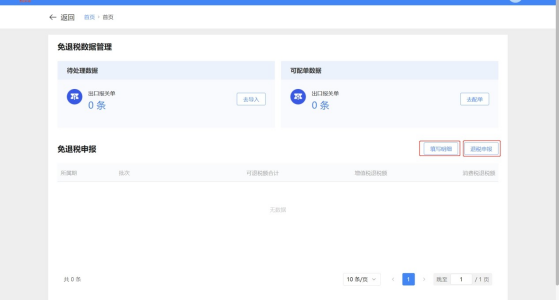 (1)进入系统后,页面上方展示当前系统内待处理报关单条数和可配单报关单条数,界面下方展示所属期、批次、可退税额合计、增值税退税额和消费税退税额。