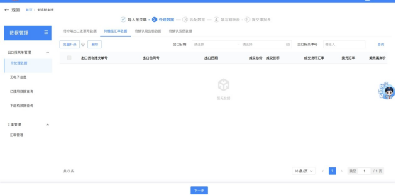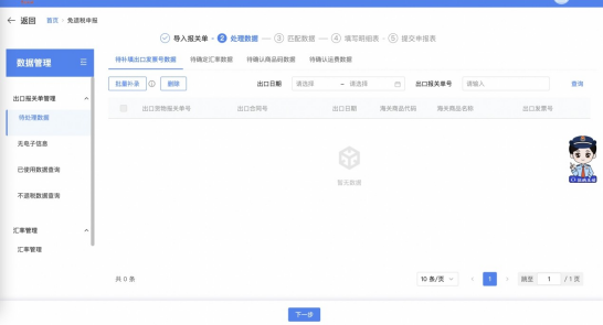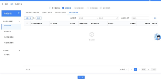 2.出口报关单管理-待处理数据中,系统自动将纳税人导入的出口报关单数据进行分类,分为“待补填出口发票号数据”、“待确认汇率数据”、“待确认商品码数据”和 “待确认运费数据”。