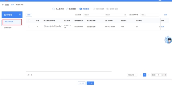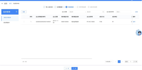 (8)进入“匹配数据”界面后选择“按报关单配单”,界面展示已处理过的报关单数据。