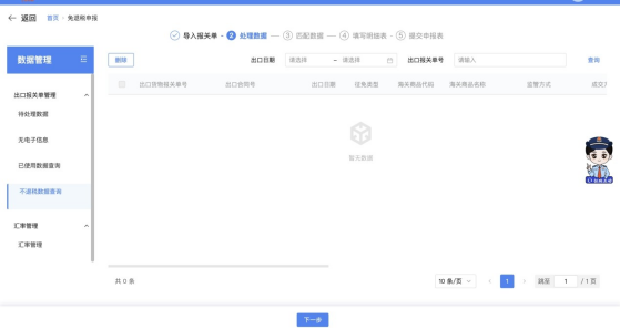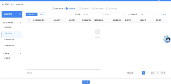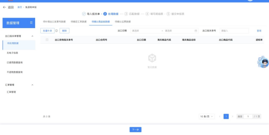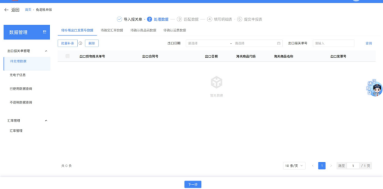 (2)点击“待处理数据”卡片上的出口报关单条数和可配单数据”卡片上的出口报关单条数可对应跳转至“数据管理”-“处理数据”界面和“数据匹配”界面。