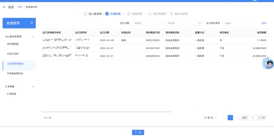(6)导入报关单数据后,点击“待处理数据”出口报关单条数,跳转至“数据管理”-“处理数据”界面,带出需要待处理的数据。