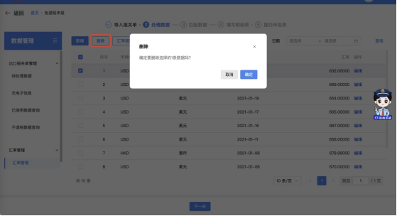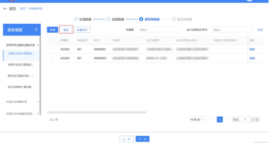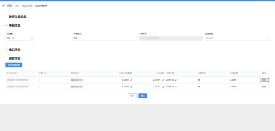 (5)选择报关单数据后,可在当前报关单数据后方点击【删除】按钮,删除此行报关单数据。