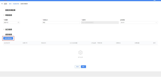 (2)“按发票配单”界面,录入需要生成的“所属期 ”和“批次”和进货信息中的“拟配单金额”,点击【选择报关单信息】按钮,弹出“选择报关单信息”窗口。