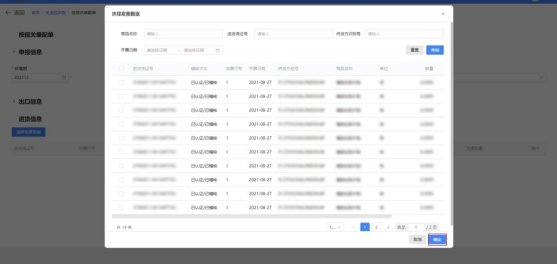 (3)“选择报关单信息”窗口中,输入查询条件,勾选对应的出口货物报关单数据,点击【确定】按钮,完成配单。