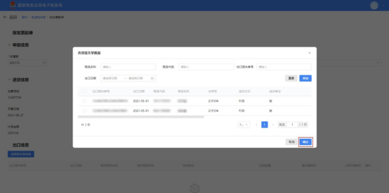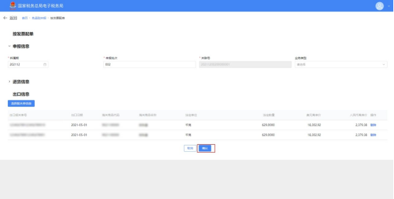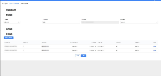 (4)选择报关单数据后,在“按发票配单”界面下方,点击【确定】,数据会进入到外贸企业出口退税出口明细申报表和外贸企业出口退税进货明细申报表中。