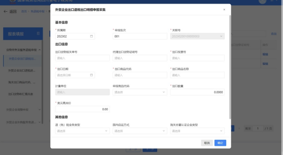 10.出口退(免)税,属于免退税计算方法的货物数据,根据企业的业务情况可在此菜单对以下业务数据进行采集:“海关出口商品代码、名称、退税率调整对应表”和“出口货物收汇申报表”,点击后可进入对应表单界面。