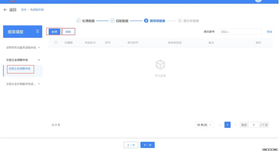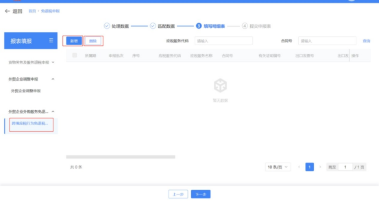 (2)如纳税人需要跨境应税行为申报可选择“外贸企业外购服务免退税申报”,可填写跨境应税行为免退税申报明细表,其中点击【新增】按钮,可弹出新增窗口进行数据录入操作,勾选数据点击【删除】按钮,可将勾选数据进行删除。