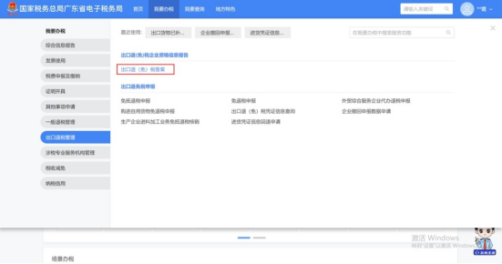 1.登录新电子税局后,点击【我要办税】-【出口退税管理】-【出口退(免)税企业资格信息报告】-【出口退(免)税备案管理】功能菜单。