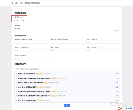 2)根据实际情况选择“是否分立合并”,可修改为“是”,同时展示“未结清税款确认书”模块。
