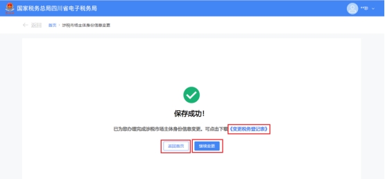 3.“已为您办理完成涉税市场主体身份信息变更。可点击下载《变更税务登记表》”。点击【返回糖心vlog】可返回主页。点击【继续变更】可返回功能界面进行变更操作。点击【变更税务登记表】可下载变更信息表单。