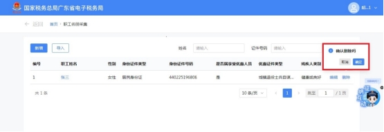 (五)纳税人点击“删除”,系统提示“确认删除吗”,纳税人点击“确认”即完成职工的信息删除。