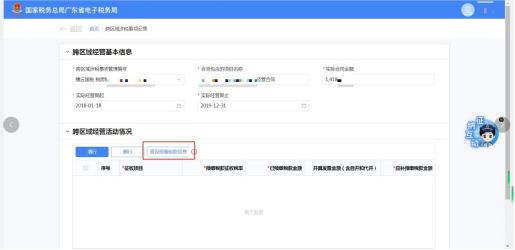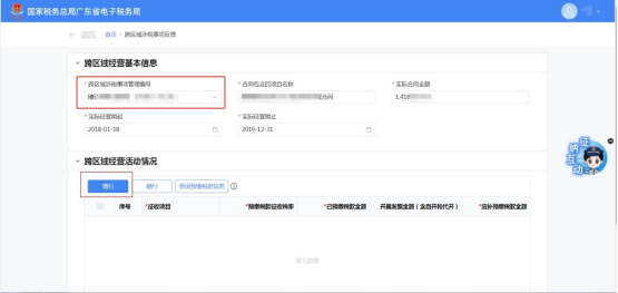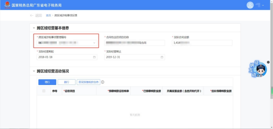 进入界面,选择“跨区域涉税事项管理编号”,系统会自动带出“合同包含的项目名称”、“实际合同金额”、“实际经营期起”及“实际经营期止”,纳税人可自行修改。