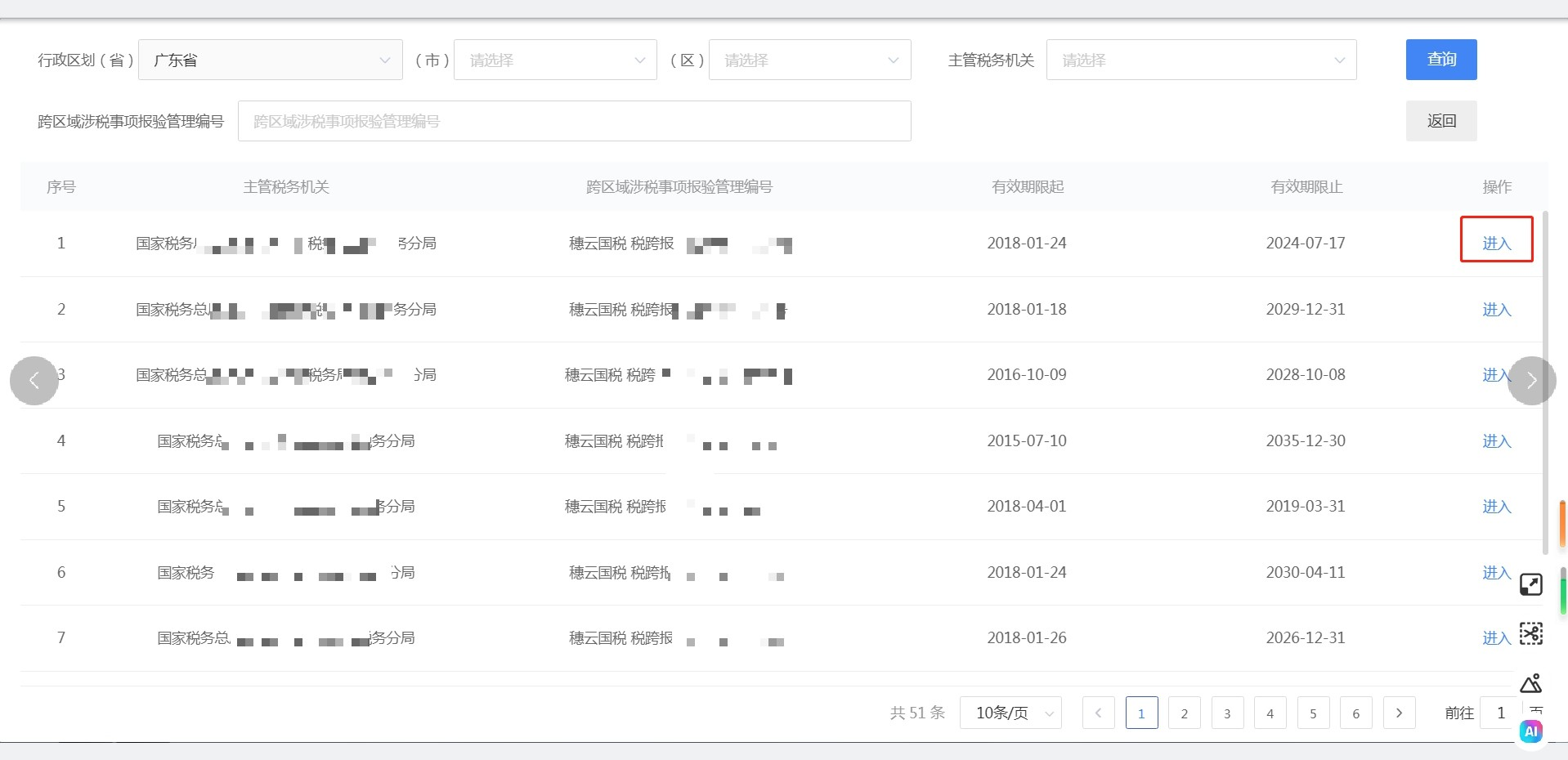 点击登录后,系统会自动带出该联系人对应的所有跨区域涉税事项报验信息,纳税人选择相应报验信息点击【进入】。纳税人也可通过筛选行政区划、主管税务机关等信息进行查询。