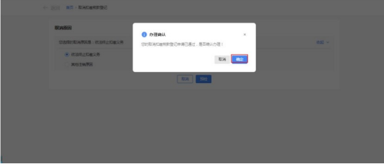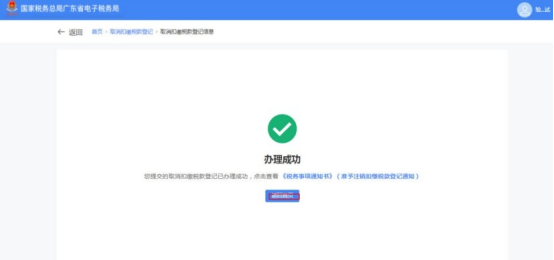 (1)当纳税人符合自动审核条件时,系统提示:您的取消扣缴税款登记申请已通过,是否确认办理”。点击【确定】,系统提示:办理成功,您提交的取消扣缴税款登记已办理成功,点击查看《税务事项通知书》(准予注销扣缴税款登记通知),可点击可点击【返回糖心vlog】按钮回到糖心vlog。