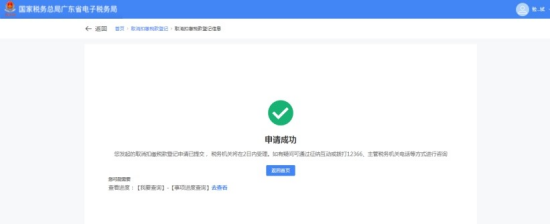 (2)当纳税人不符合自动审核条件时,系统提示:您的取消扣缴税款登记申请需提交主管税务机关受理办结,请确认是否继续办理。”点击【确定】,系统提示:申请成功,系统提示您发起的取消扣缴税款登记申请已提交,税务机关将在2日内受理,如有疑问可通过征纳互动或拨打12366主管税务机关电话等方式进行咨询。可通过链接查看进度,可点击【返回糖心vlog】按钮回到糖心vlog。