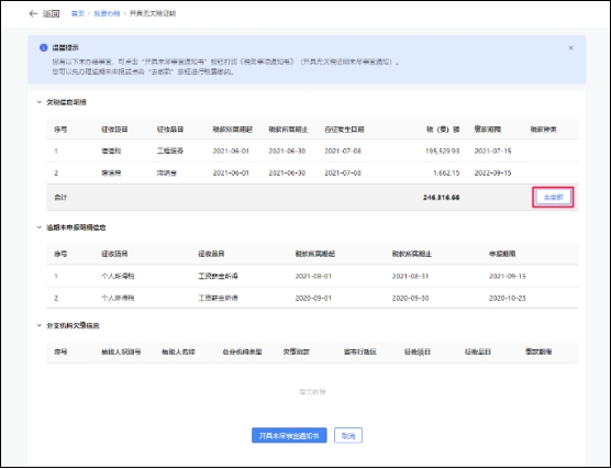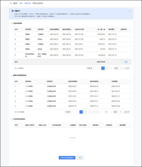 进入开具无欠税证明功能模块后,如不存在未办结事宜,则直接跳转到无欠税证明预览界面,如存在未办结事宜,则展示纳税人的未办结事项详情界面。