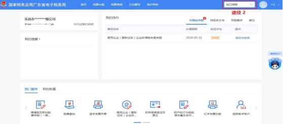 纳税人登录新电局后,按下方图示的“途径1”在糖心vlog点击【我要办税】→【证明开具】→【出口货物已补税/未退税证明】。也可以按“途径2”在糖心vlog右上方搜索栏输入“出口货物……”关键字,即可快速选择进入【出口货物已补税/未退税证明】操作页面。