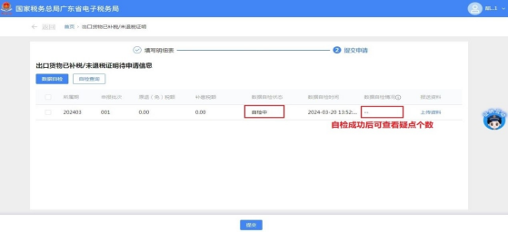 勾选需要自检的数据,点击【数据自检】,自检成功后可在“数据自检情况”下查看疑点个数,点击具体的“疑点个数”,可查看疑点详情。如图:
