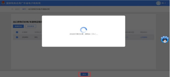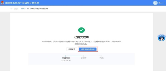 确认信息无误后,勾选申报信息栏,点击【提交】。提交成功后,可点击【退税审核进度查询】,可实时查询税务机关对该证明业务的审核状态及流程息。