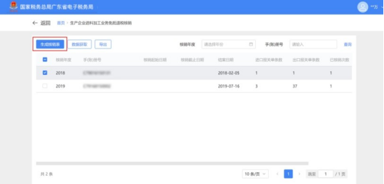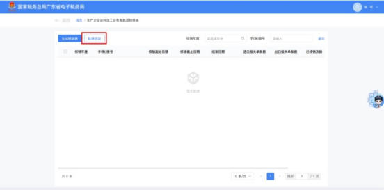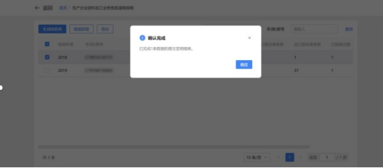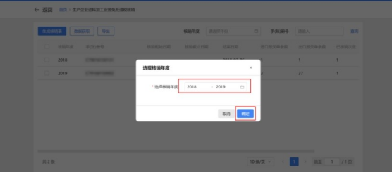 1.点击“数据获取”,输入“核销数据年度”,点击“确认”按钮,可在列表中查看加贸数据获取情况。