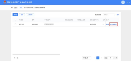 5.点击“补录调整表”按钮,可进入已核销手册(账册)海关数据调整表列表页面,展示该手账册下补录的所有报关单信息。