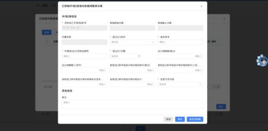 1.点击“新增”按钮,弹出“已核销手(账)册海关数据调整表采集”页面,填写需要补录的报关单信息。