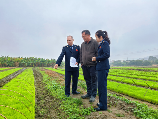 (图片说明:税务人员到斗门区伟新水稻种植专业合作社实地走访,了解育秧情况。)