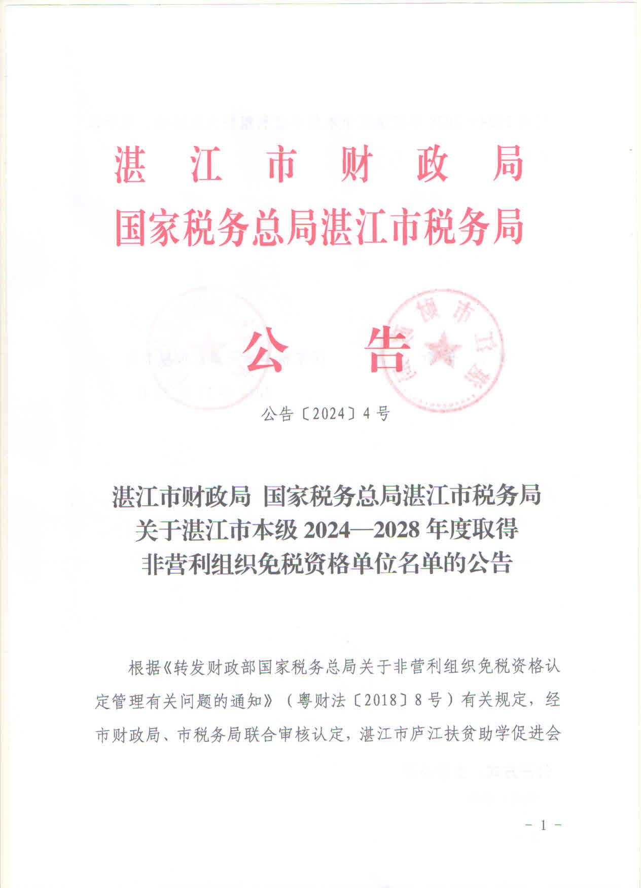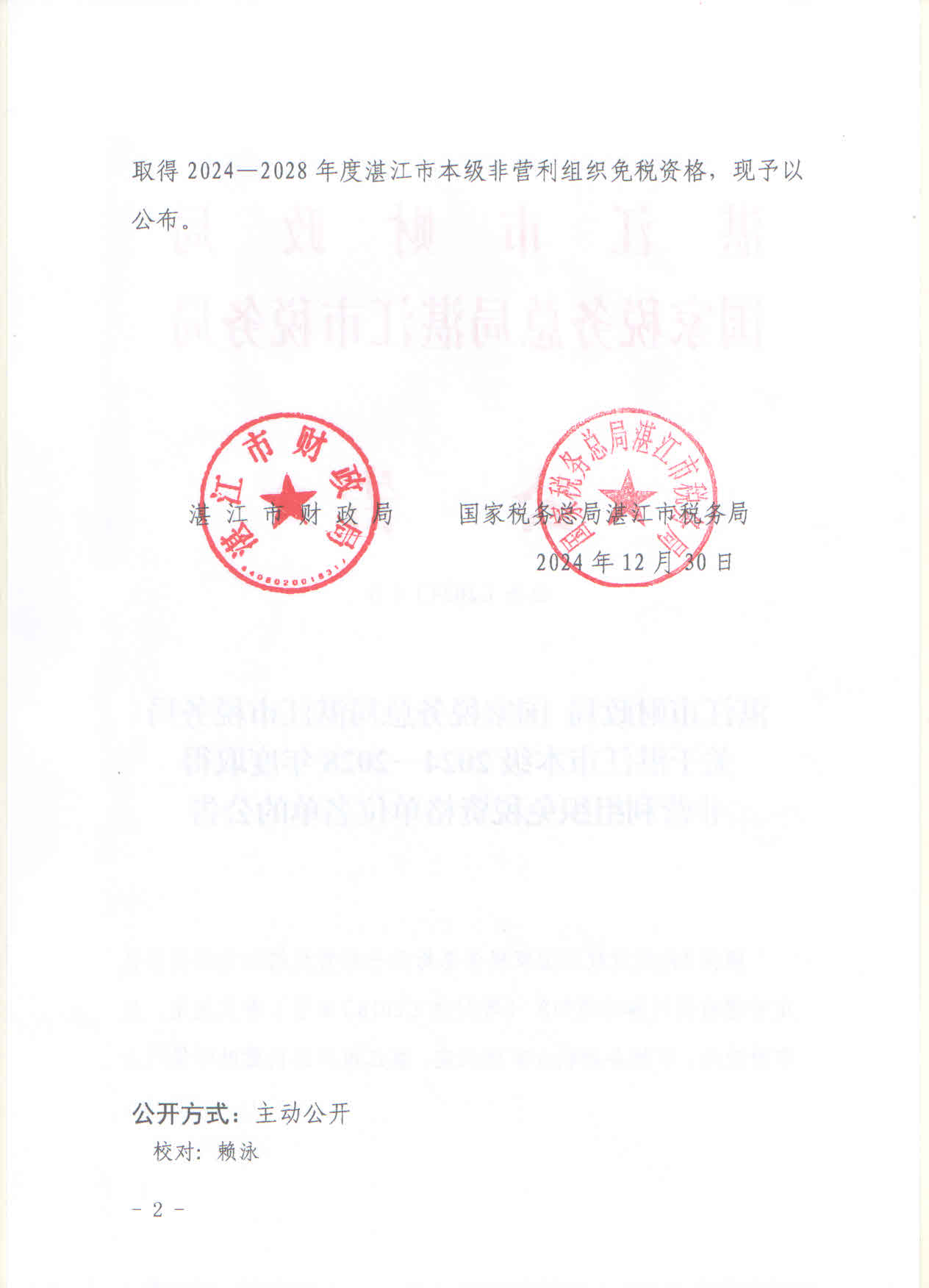 湛江市财政局 糖心vlog 湛江市税务局关于湛江市本级2024—2028年度取得非营利组织免税资格单位名单的公告
