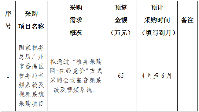 广州市番禺区税务局2022年4月至6月采购意向公开如下: