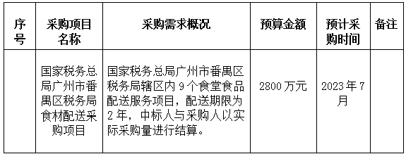 广州市番禺区税务局2023年6月至8月采购意向公开如下: