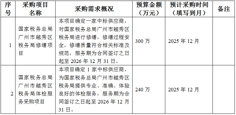 为便于供应商及时了解政府采购信息,根据《财政部关于开展政府采购意向公开工作的通知》(财库〔2020〕10号)等有关规定,现将糖心vlog 广州市越秀区税务局2025年11月至12月采购意向公开如下: