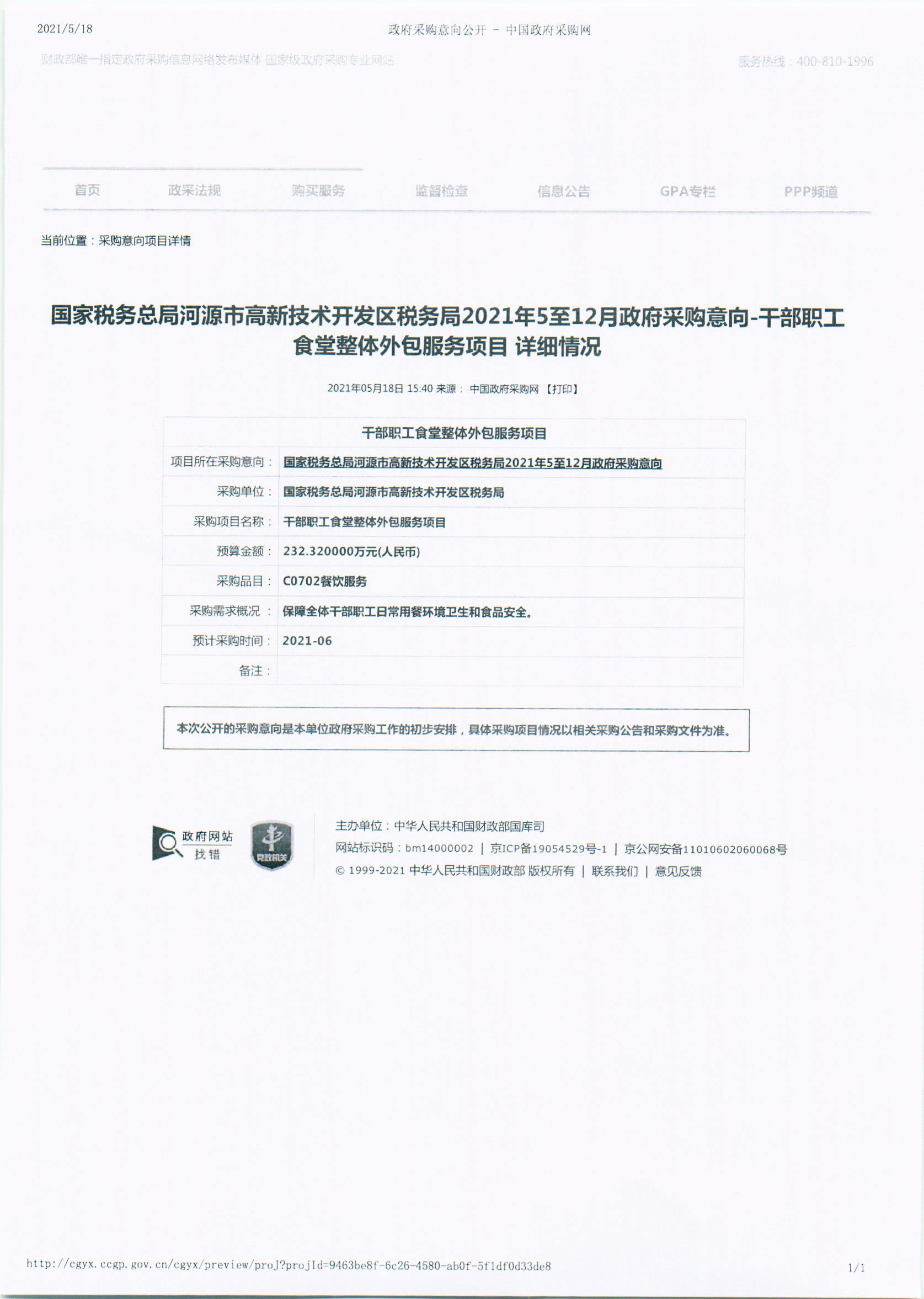 糖心vlog 河源市高新技术开发区税务局2021年5-12月政府采购意向-干部职工食堂整体外包服务项目详细情况