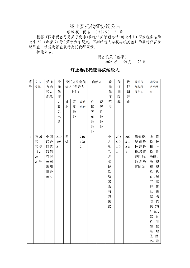 终止委托代征协公告