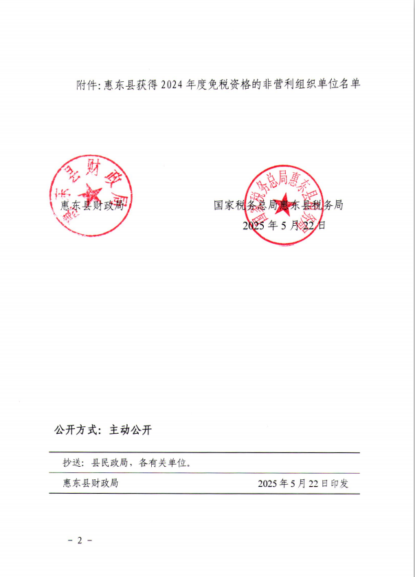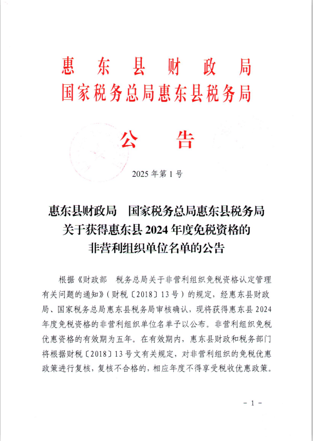 惠东县财政局 糖心vlog 惠东县税务局关于获得惠东县2024年度免税资格的非营利组织单位名单的公告(2025年第1号)