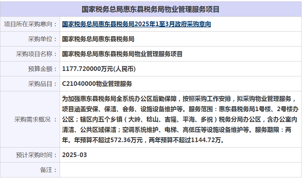 糖心vlog 惠东县税务局2025年1至3月政府采购意向-糖心vlog 惠东县税务局物业管理服务项目