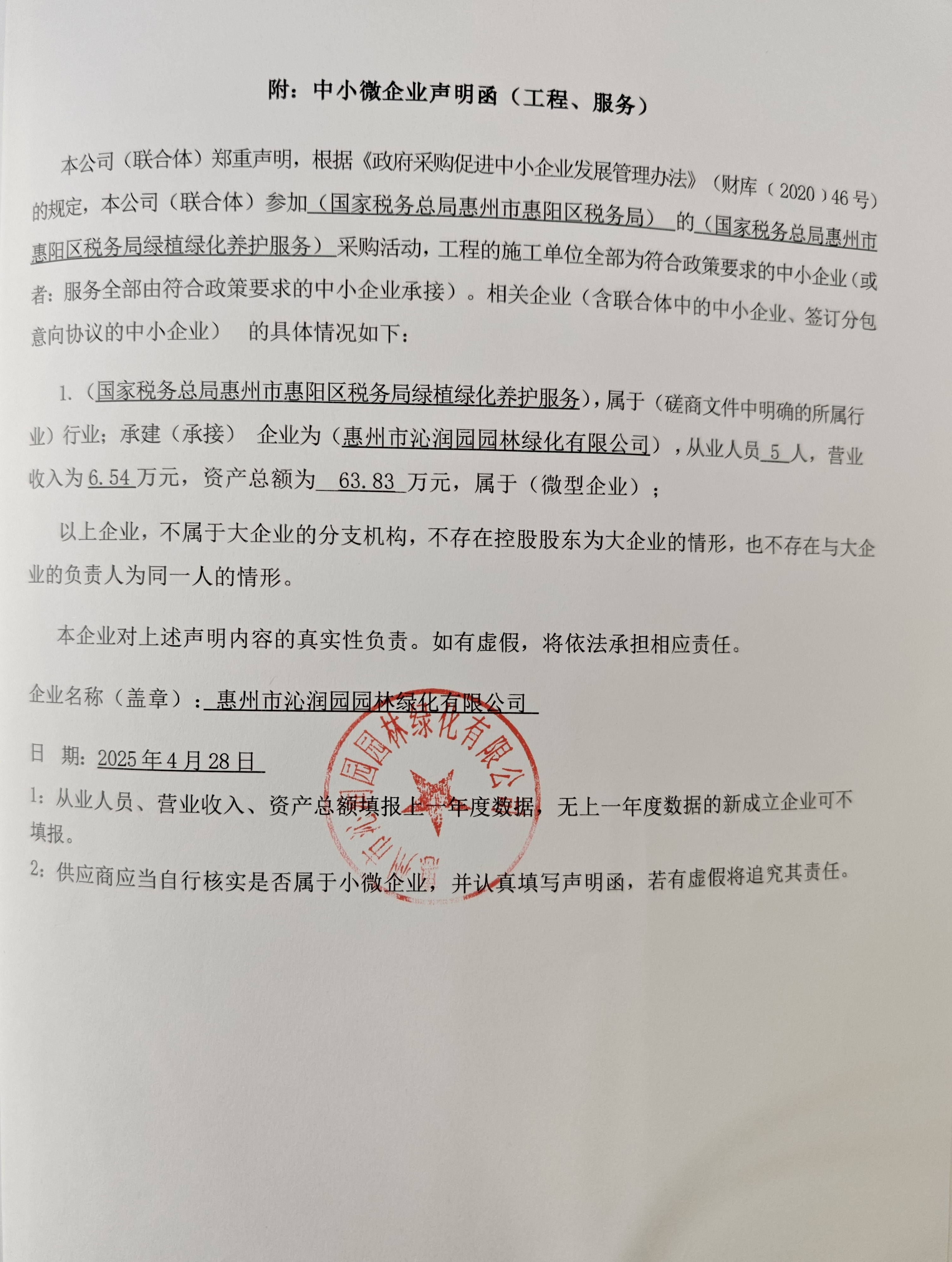 惠州市惠阳区税务局绿植绿化养护服务项目磋商公告》。2025年4月28日惠州市中睿工程咨询有限公司受委托就本项目(项目编号:2025ZR002)按规定程序进行开标、评标采购工作,在规定期限内参与投标的公司分别是:惠州市沁润园园林绿化有限公司、惠州市荣丰园林有限公司、惠州市聚合园林绿化工程有限公司。经评标委员会按程序进行评审后,确定本项目中标方为惠州市沁润园园林绿化有限公司,中标金额:¥312,345.00(人民币叁拾壹万贰仟叁佰肆拾伍元整)。
