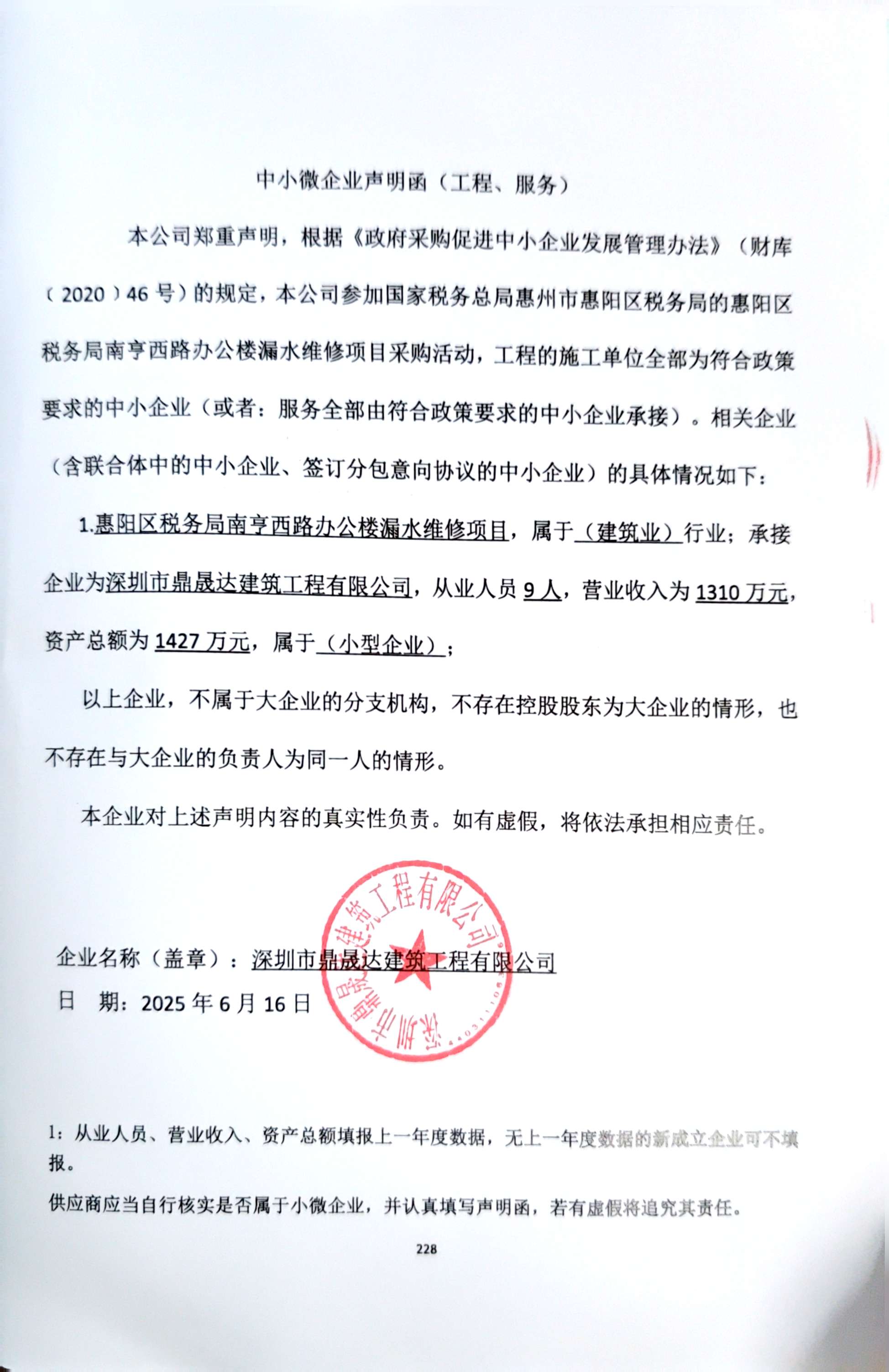 惠州市惠阳区税务局网站发布了《惠阳区税务局南亨西路办公楼漏水维修项目磋商公告》。2025年06月16日惠州市嘉实招标代理有限公司受委托就本项目(项目编号:2025JS012)按规定程序进行开标、评标采购工作,在规定限期内参与投标的公司分别是:广东均兴建设工程有限公司、广东森盛华建设工程有限公司、深圳市鼎晟达建筑工程有限公司。经评标委员会按程序进行评审后,确定本项目中标方为深圳市鼎晟达建筑工程有限公司,中标金额:¥628,000.00(人民币陆拾贰万捌仟元整)。