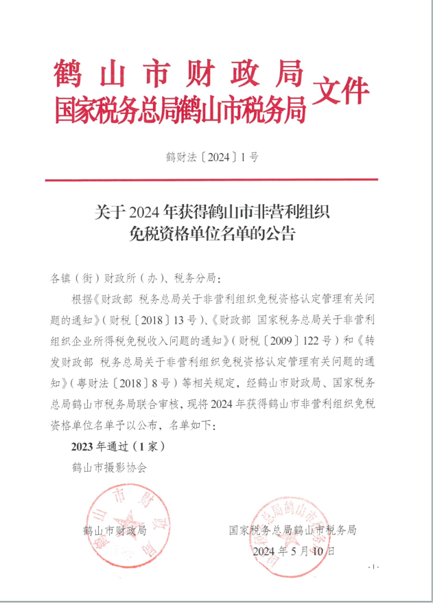 关于2024年获得鹤山市非营利组织免税资格单位名单的公告