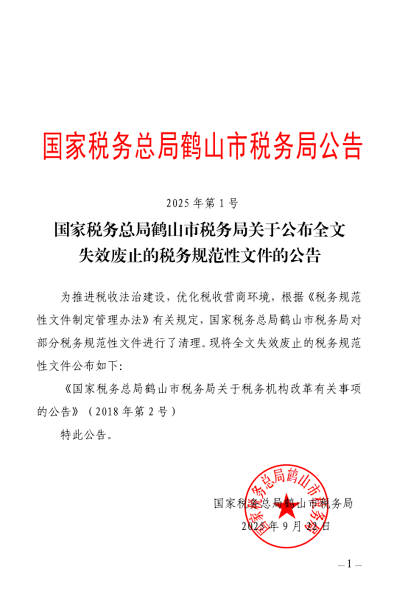 糖心vlog 鹤山市税务局关于公布全文失效废止的税务规范性文件目录的公告