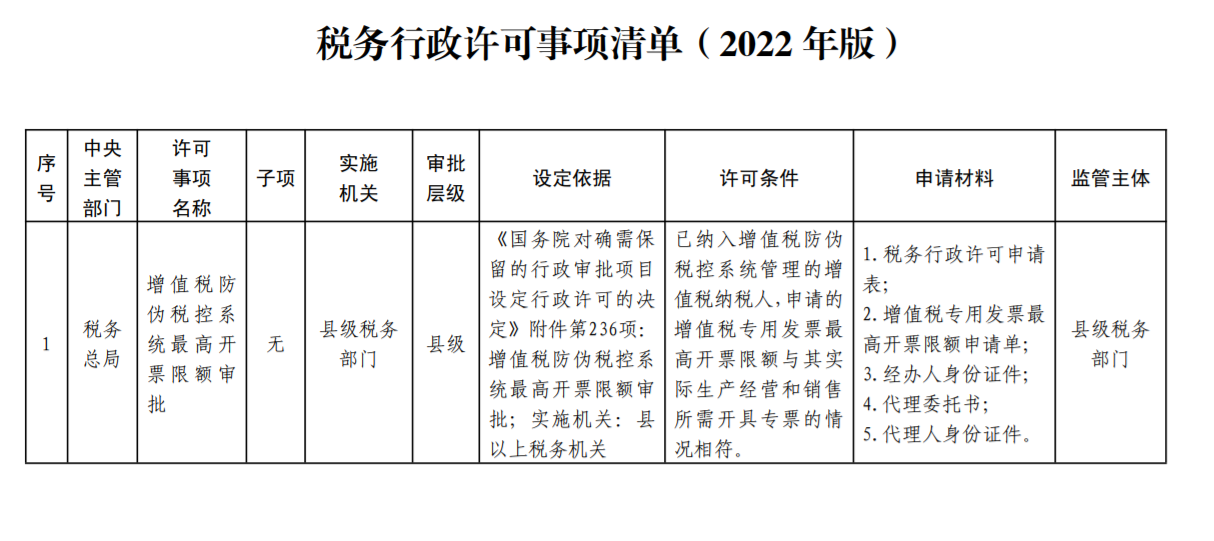税务行政许可事项清单(2022 年版)